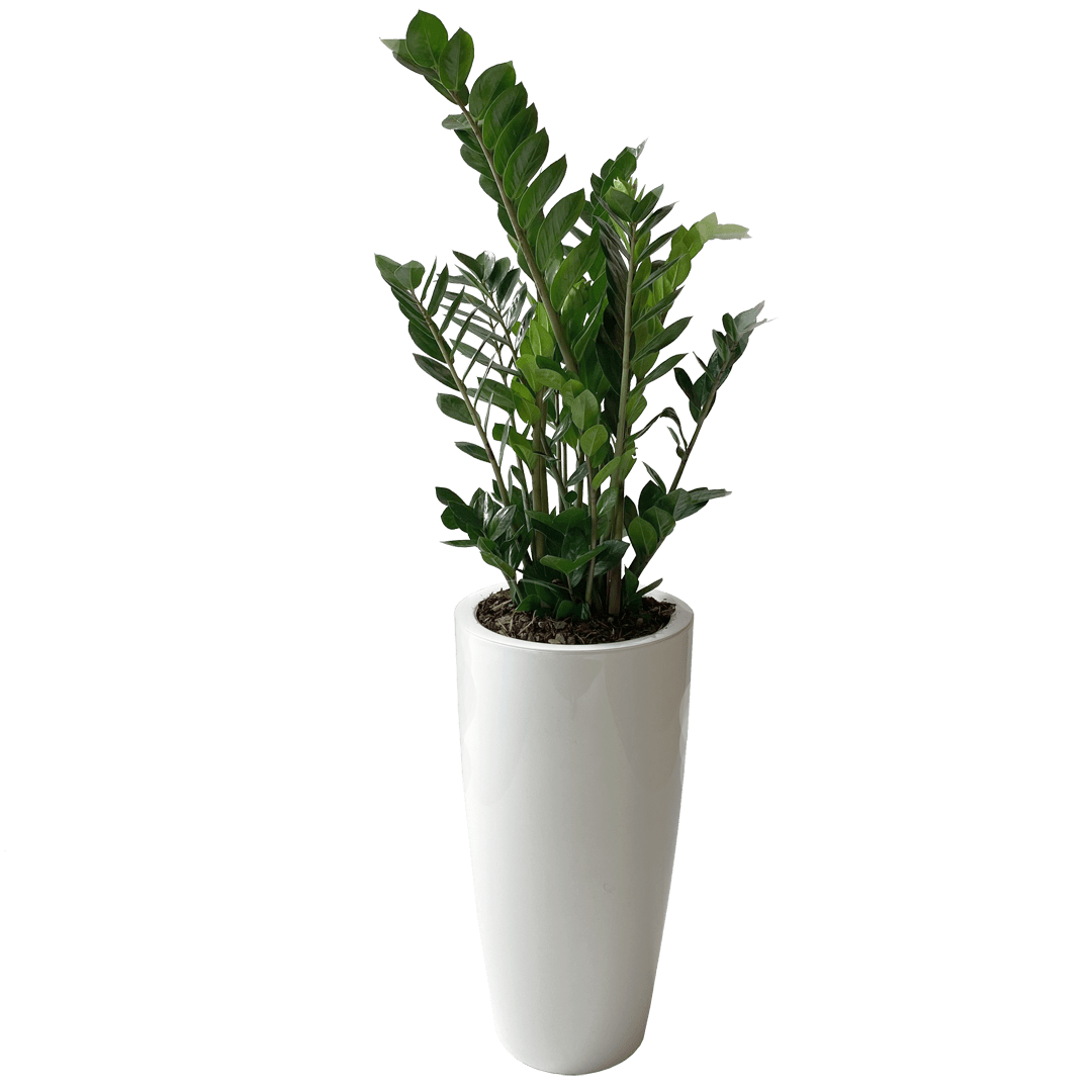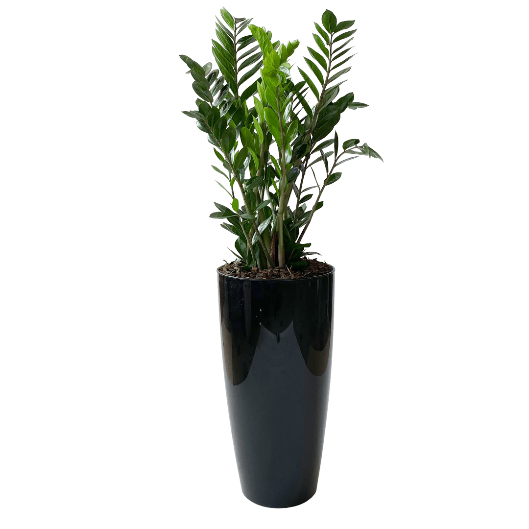 Zamiculosa planted in round, 65cm high plastic planter. Total height with plant 110cm.