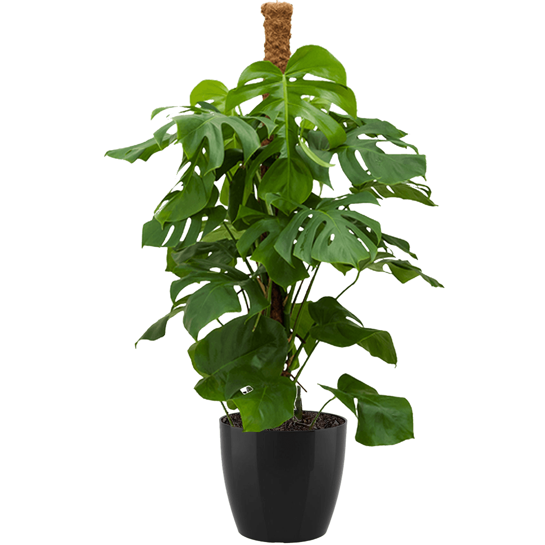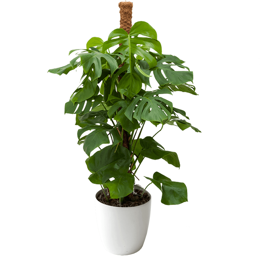 Монстера на шесте из мха в круглом горшке диаметром 35 см. Общая высота с растением 140 см